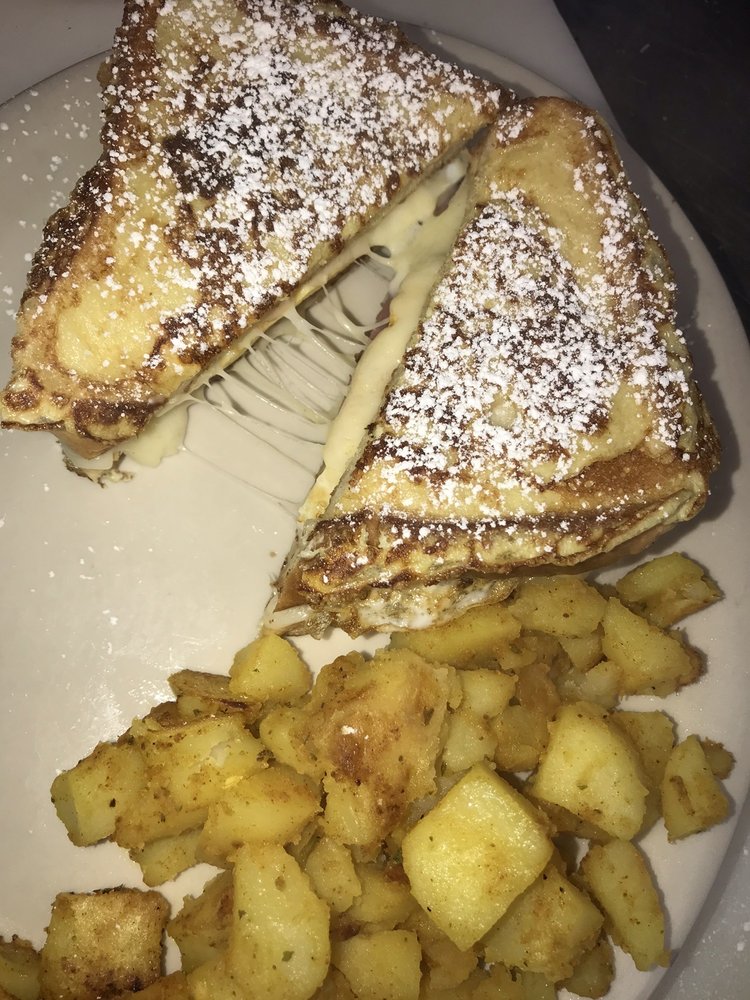Ham and cheese sandwich that has been dipped in egg and fried.