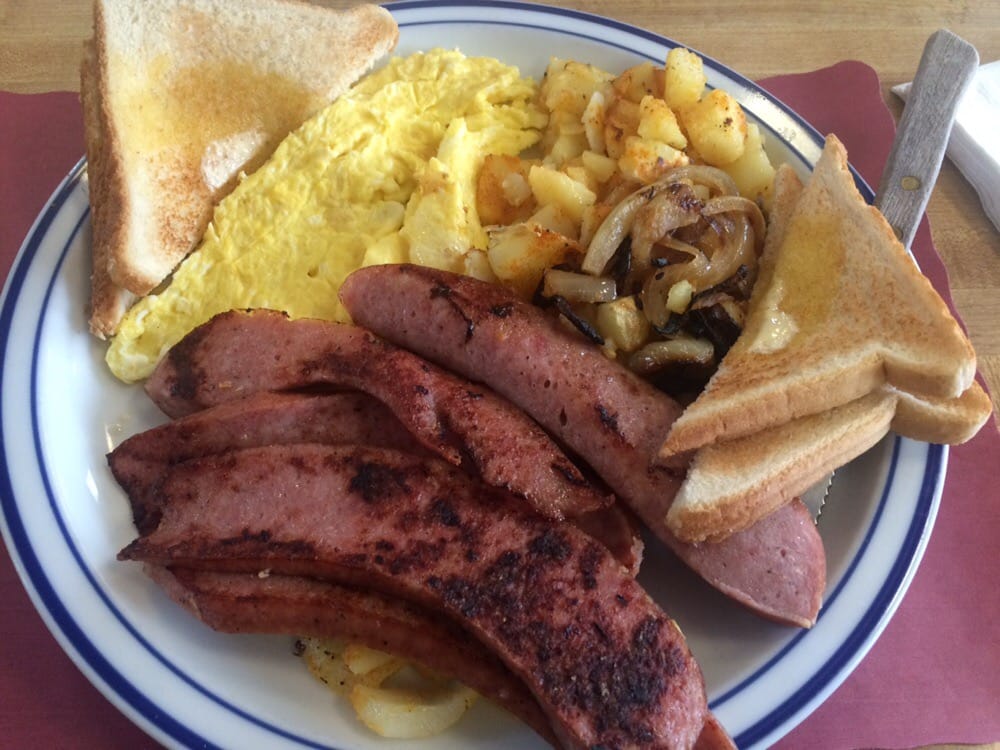 2 eggs, home fries, pick 2 bacon or ham or sausage, and pick 2 pieces pancake or French toast.